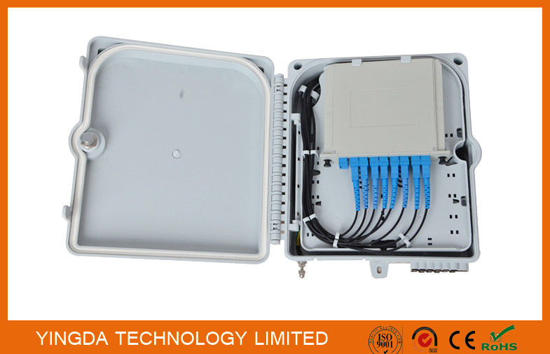 Cette boîte de ftth termine jusqu'à 2 câbles optiques de fibre, offre l'espace pour des diviseurs et jusqu'à 12 fusions, assigne 8 PCs des adaptateurs de Sc avec le module de diviseur de PLC 1x8 et du travail sous les environnements d'intérieur et extérieurs. C'est un solution-fournisseur rentable parfait dans les réseaux de FTTx.